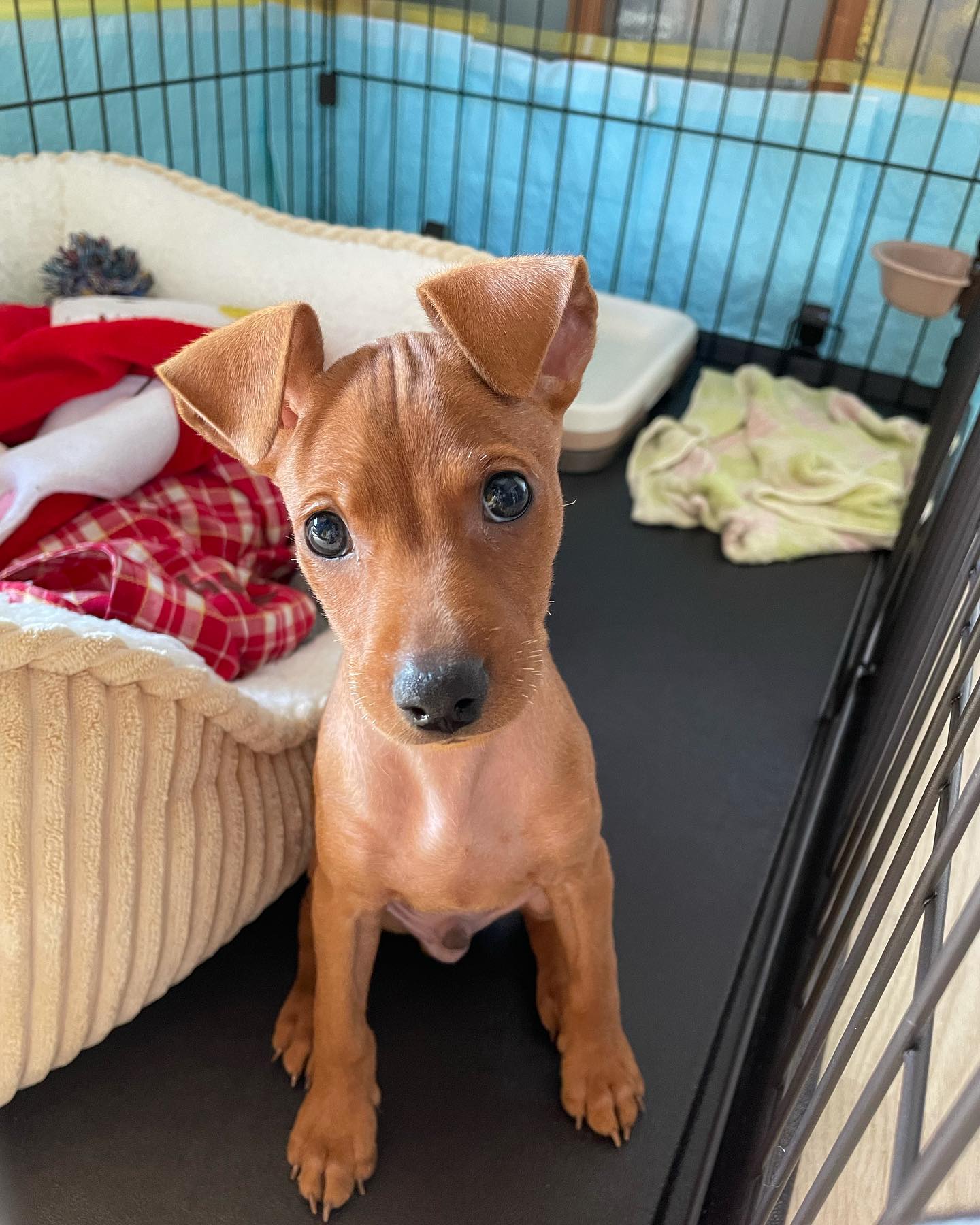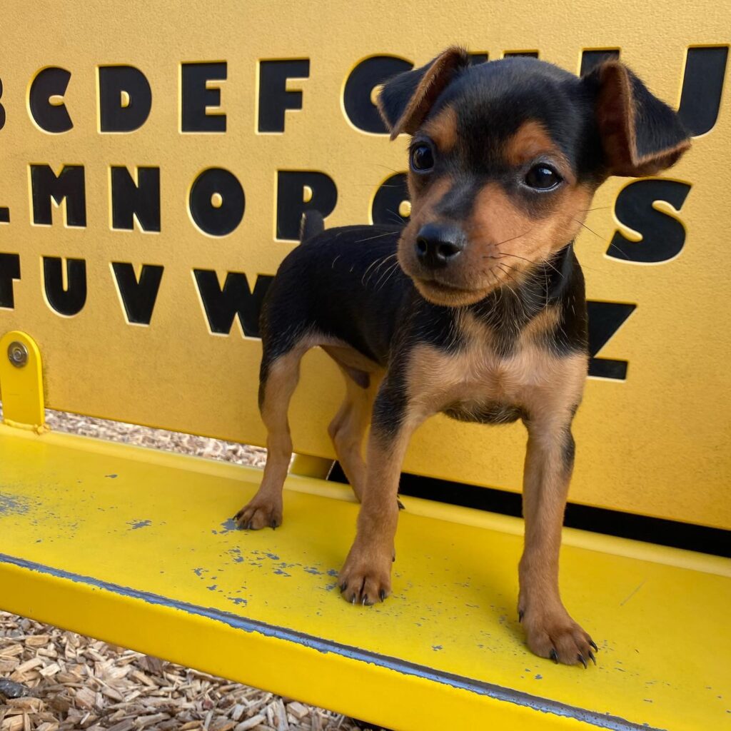 Personality: This playful Female Miniature Pinscher pup With a cropped tail is full of energy, and very charming! She loves to bounce around, explore, and cuddles. With her big personality and sweet nature, she’s ready to bring fun and love to her forever home.